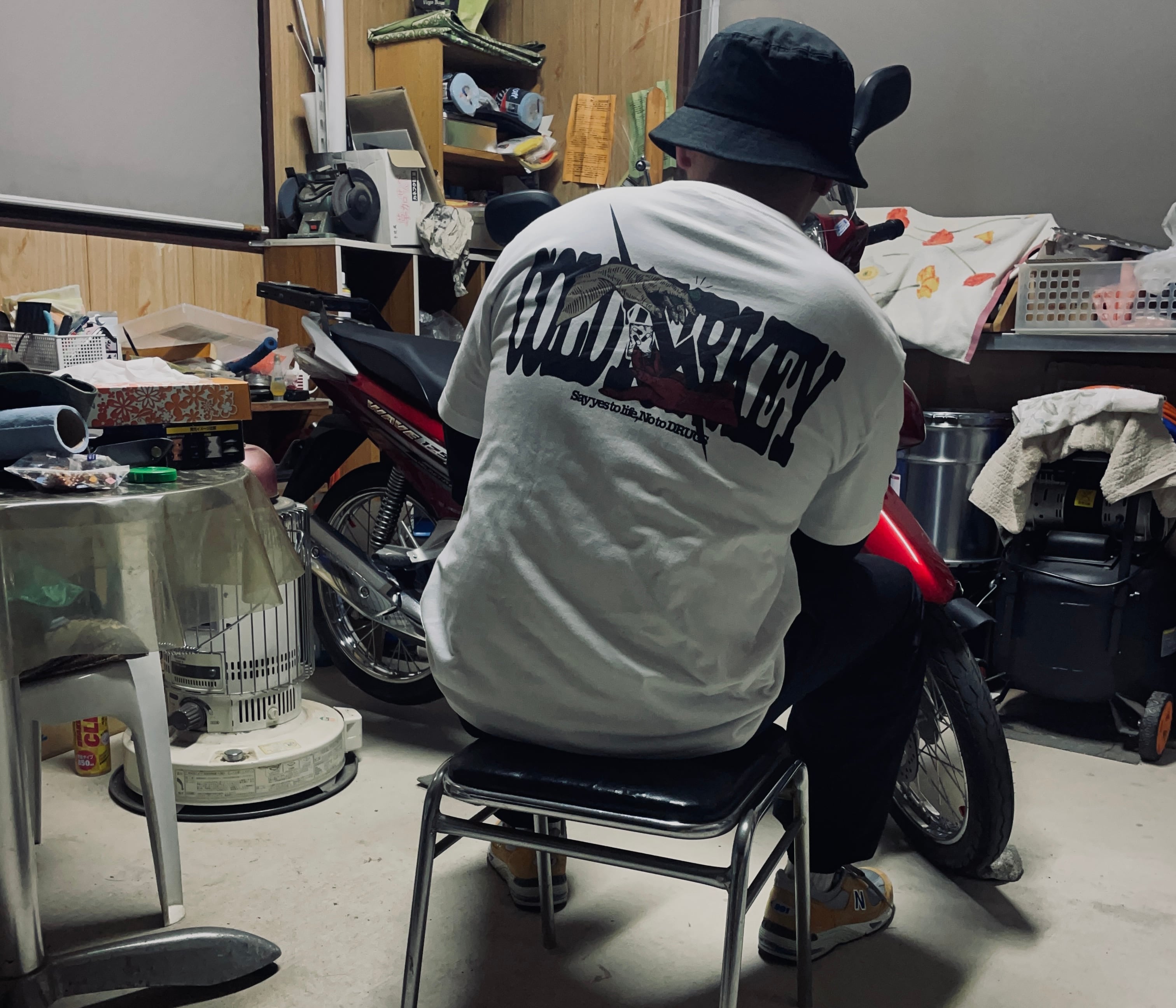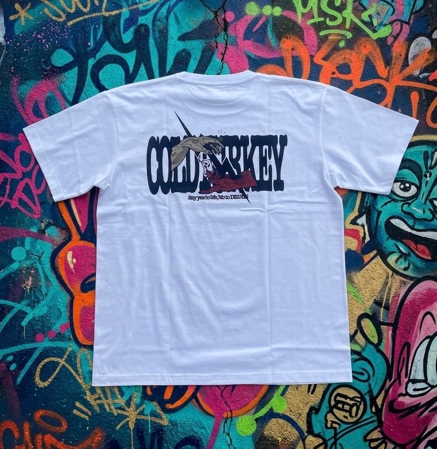 フロントはCOLDTURKEYというロゴデザインで、バックには薬を買おうとしている2人に稲妻が走り罰を与えているデザインとなったおります。